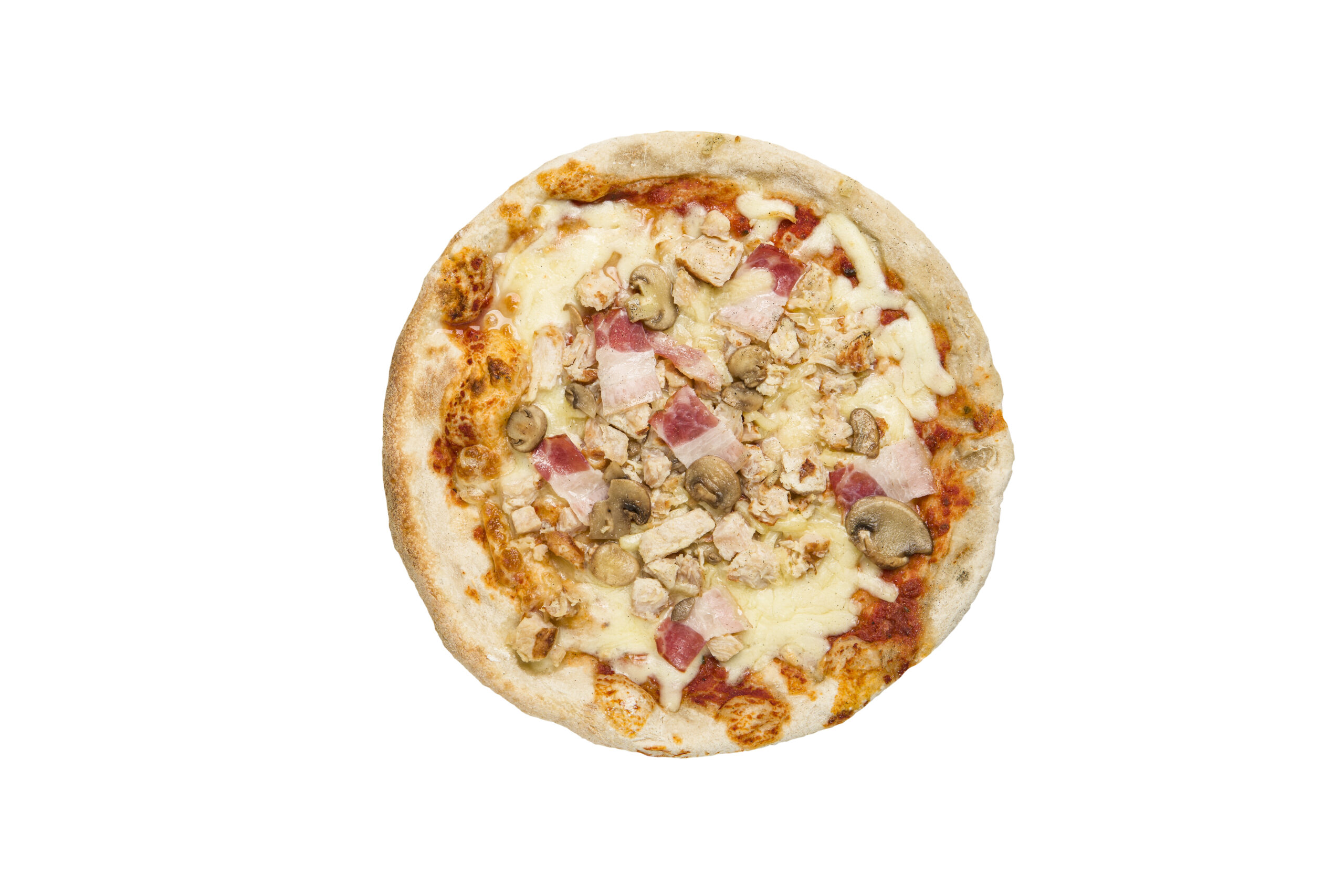 Si a una base hecha con masa madre y cocinada en horno de piedra, acompañada de un aceite de oliva virgen extra y una deliciosa combinación de quesos, le unimos un bacon crujiente y dorado, unos champiñones frescos y aromáticos y una pechuga de pollo braseada tierna y jugosa… conseguimos la pizza que tu madre querría para ti.